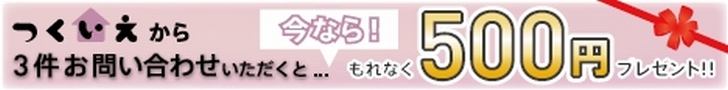 つくいえでは現在、物件を3件以上お問い合わせいただいたみなさんに、もれなく現金500円をプレゼントするキャンペーンを行っております。